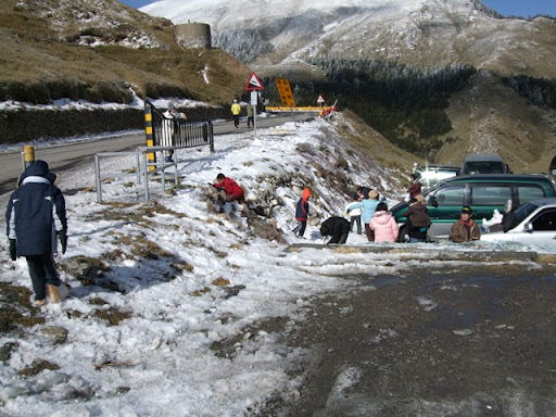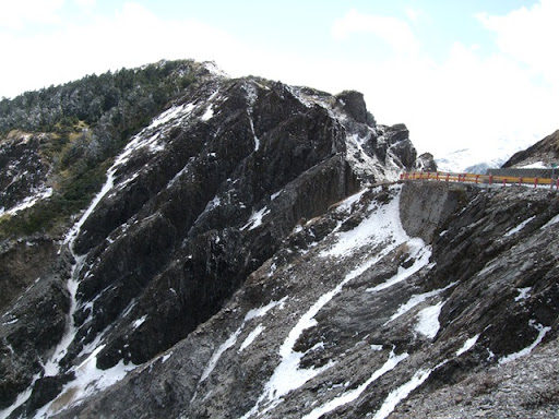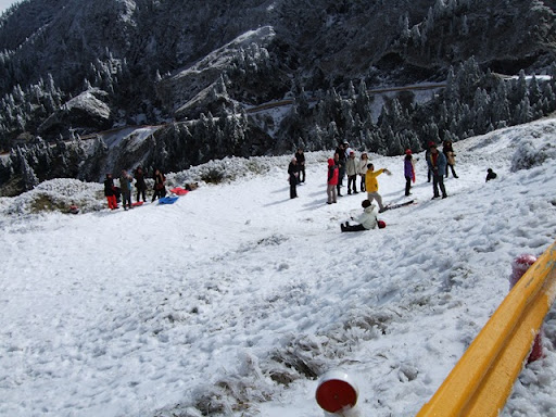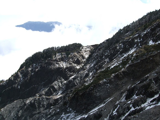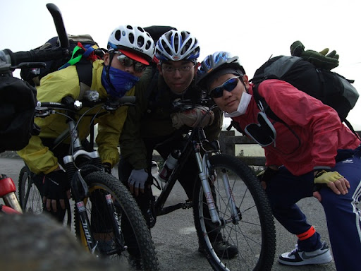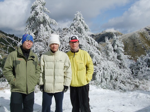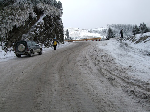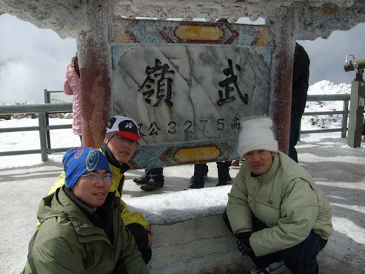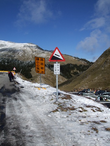 在鳶峰等了一下子,打電話給Upsha,告訴我離鳶峰只剩1公里,他是用牽的,而bypeng在他後面不遠。我先到鳶峰的觀景台上看看景色,但其實到處都是霧都看不太清楚。在景觀台上和一個先生聊天,他對我們在這種天氣要騎到合歡山莊感到不可思議,不過話說他自己也是這種天氣要去爬合歡東峰,晚上還要睡在車上,這種天氣上來這裡的人大概都有點瘋了吧。由那位先生我們打聽到了上過昆陽後路邊是有些積雪,昆陽有管制站,四輪車在17:00後禁止往開合歡山方向,但腳踏車要上武嶺應該不是問題,主要是從武嶺下滑到合歡山莊的那2公里10%的下坡積雪,會是今晚最大的難題。但是都騎到這裡了,怎麼可以輕言放棄呢!