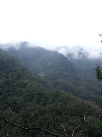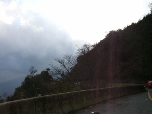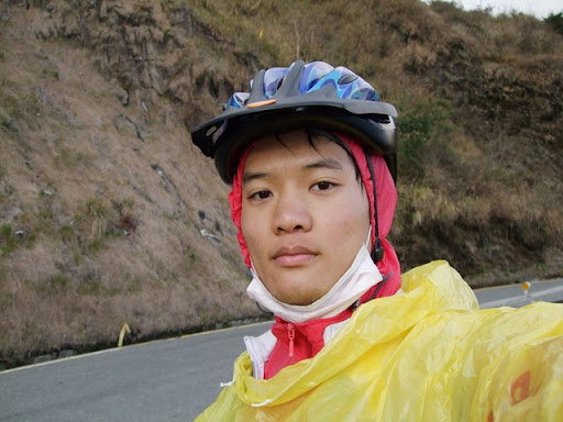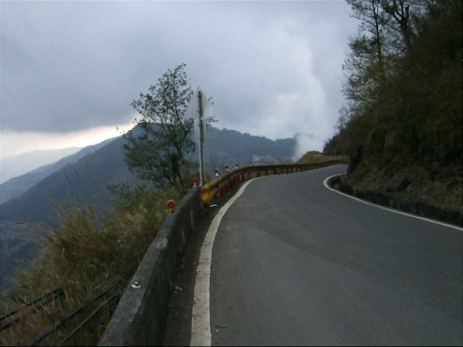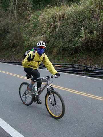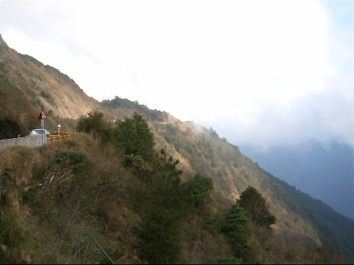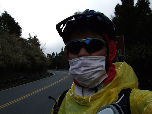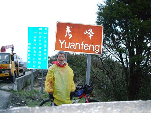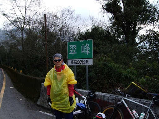 再滑下去200公尺後就又繼續爬坡,氣溫也愈來愈低,大口呼氣時會有一整片的白煙。穿輕便雨衣的確是很保暖,但雨衣裡面汗如雨下,在翠峰三人集合後我把手機相機電池之類的東西都放到前後車衣口袋,之後的爬坡更陡,而且路面不是很平坦,要保持速度和平衡又要閃避車輛花了很多力氣,過翠峰約兩公里後景色突然寬闊,從山上可以看來遠方的清境(?),前後的路就沿著山側彎蜒而上,遠遠好像看到Upsha下來牽車,等了一下子身體馬上就冷掉了,為了保暖我就先繼續往上爬,漸漸山區開始起霧了,把前後燈打開,腳還是不停的踩,翠峰到鳶峰的距離不算短,但我下車休息的時間都不敢太長,因為實在太冷了,停下來不到三分鐘就會冷掉。好不容易看到了鳶峰停車場一公里的路牌,終於在17:20到達了鳶峰,距離武嶺只剩下昆陽了!