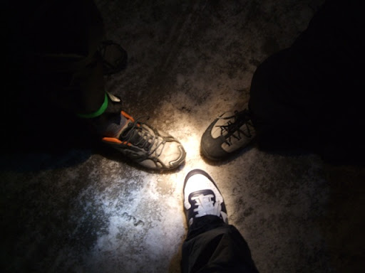 下坡的路真是又陡又滑,Upsha在前方帶路,我走中間,bypeng墊後。雪地其實比較好走,結冰的路非常的滑,完全沒辦法走,我們沿著山壁緩慢的往下走,中間不小心走到結冰處還滑倒一次,幸好有牛角的保護沒有受傷。有一段路又陡又窄找不到雪踩,照了鞋子才發現其實右腳的鐵鍊早就斷了,遍尋不著著力處,只好拿出鍊鍊和束帶重綁兩條,勉強繼續往下走,比昆陽上來還累。在走了快兩個小時之後,一個彎路時看到前有管制柵欄的路牌,右彎之後,合歡山莊的燈光就從山壁後出現,路面不再結冰,終於我們在十一點半時到了合歡山莊。