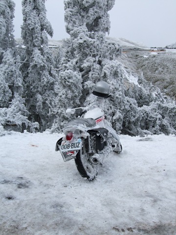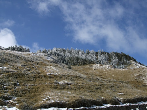 過了昆陽後坡好像變得更陡,要保持住節奏左右左右的前進,車則是冰得不得了,牽車的手指頭凍得不聽使喚,不管我抓龍頭還是牛角都很冰,路邊也漸漸有積雪,草叢和樹上也都是白色的。總覺得武嶺好像很近了但卻怎麼走都走不到,身體靠著走路還能保持溫暖,大約又走了快40分鐘,我們看到前方有燈,有個先生在車子裡用手電筒照地圖,他告訴我們這裡就是合歡主峰的登山口,這個消息讓我們雀躍不已,過了主峰登山口馬上就要到武嶺了。