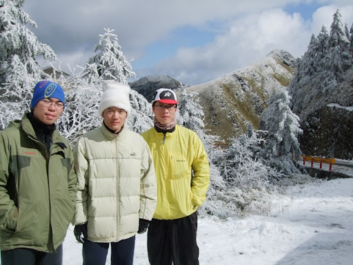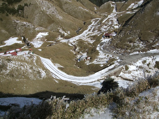 從鳶峰到武嶺快七公里500公尺的高度,牽了近三個小時。武嶺停車場結了一層冰,到處都很滑,前方往合歡山莊的下坡也埋在整片的冰雪當中。為了不要一路滑下山,我們把雪鍊綁在腳上(其實應該帶冰爪才對)沒想到我才綁好一條,在地上踩一下試試摩擦力,鍊子就斷了……但沒鍊子也不行,我在左右腳各綁了兩條20目鍊,Upsha和bypeng則是把整條鍊子繞在腳上。在武嶺還有遇到一個開車的先生很好心的要載我們去合歡山莊,但是因為沒辦法載腳踏車,所以我們還是決定要自己牽下去。